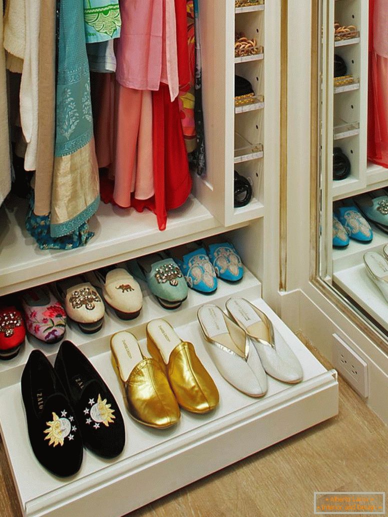 Não importa o quão pequeno o apartamento é, mas sem uma zona de armazenamento, você não pode fazer. Você pode usar móveis multifuncionais (camas com gavetas ou armários de canto). O interior não é apenas funcional, mas também muito bonito. Em qualquer caso, é necessário dar preferência a prateleiras abertas, armários embutidos e suas combinações. Classicamente, tal mobília não pode ser chamada, mas em uma pequena sala é mais do que apropriado.